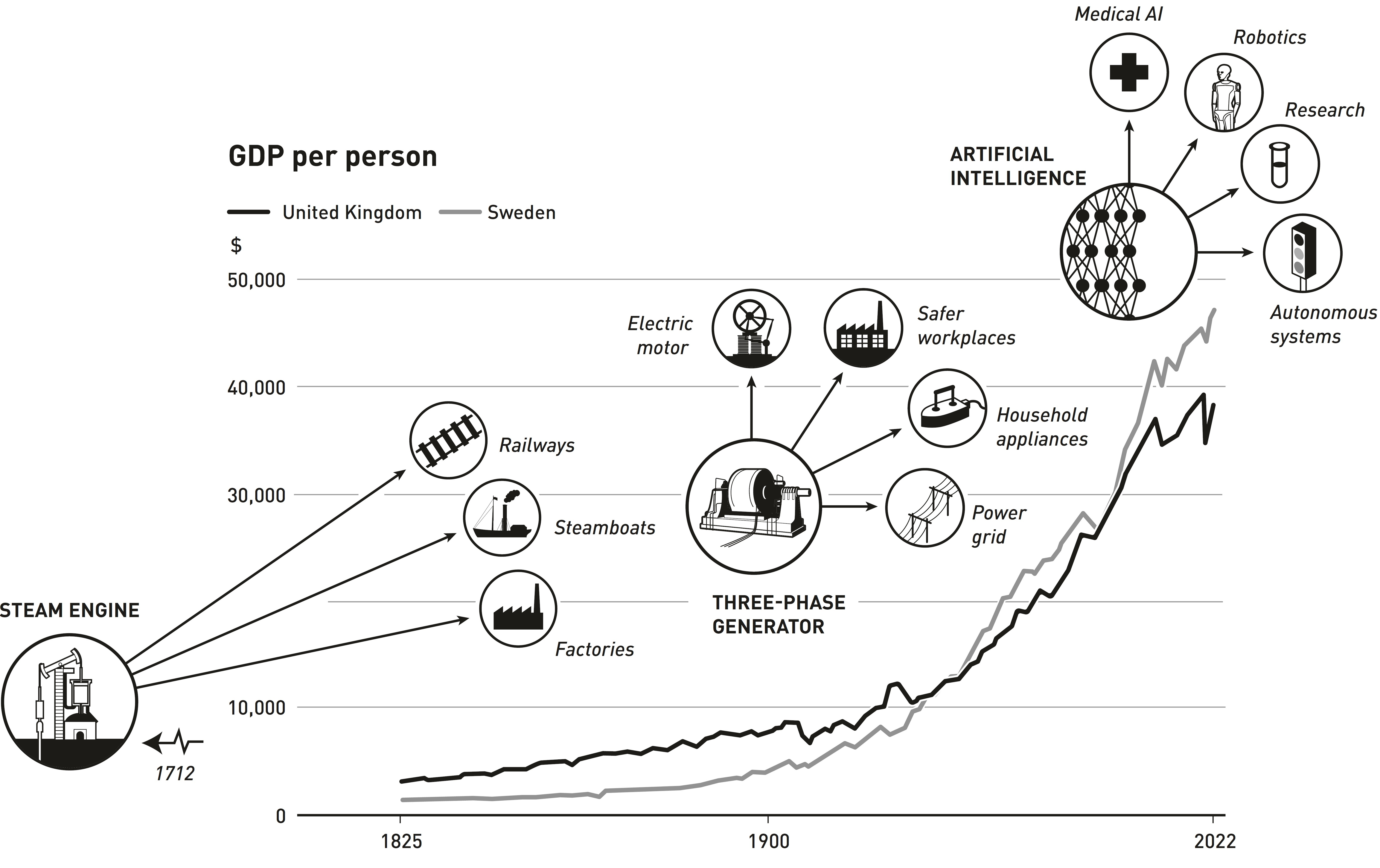 Протягом останніх 200 років щорічне економічне зростання у Швеції та Великій Британії становило близько 1,5 %. Технологічні інновації та науковий прогрес взаємодоповнювали одне одного в нескінченному циклі. Фото Нобелівський комітет
